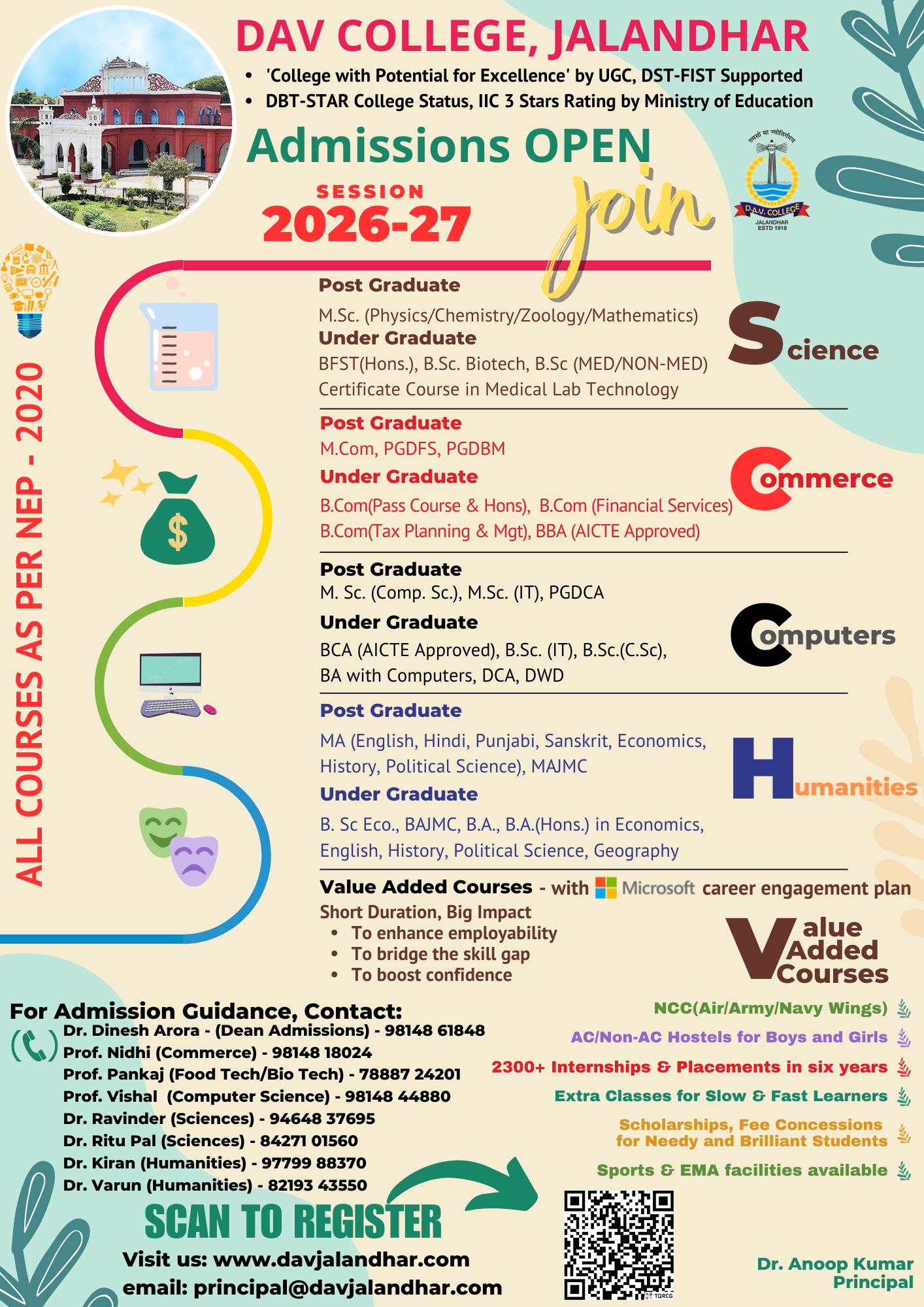 DAV College Jalandhar established in 1918 in the sacred memory of Maharishi Dayanand Saraswati to impart modern knowledge along with the Vedic traditions to the youth of contemporary India. The institution has entered into the 105th year and has established itself as an academic giant with matchless service of growth and grooming of youth in this part of the country.