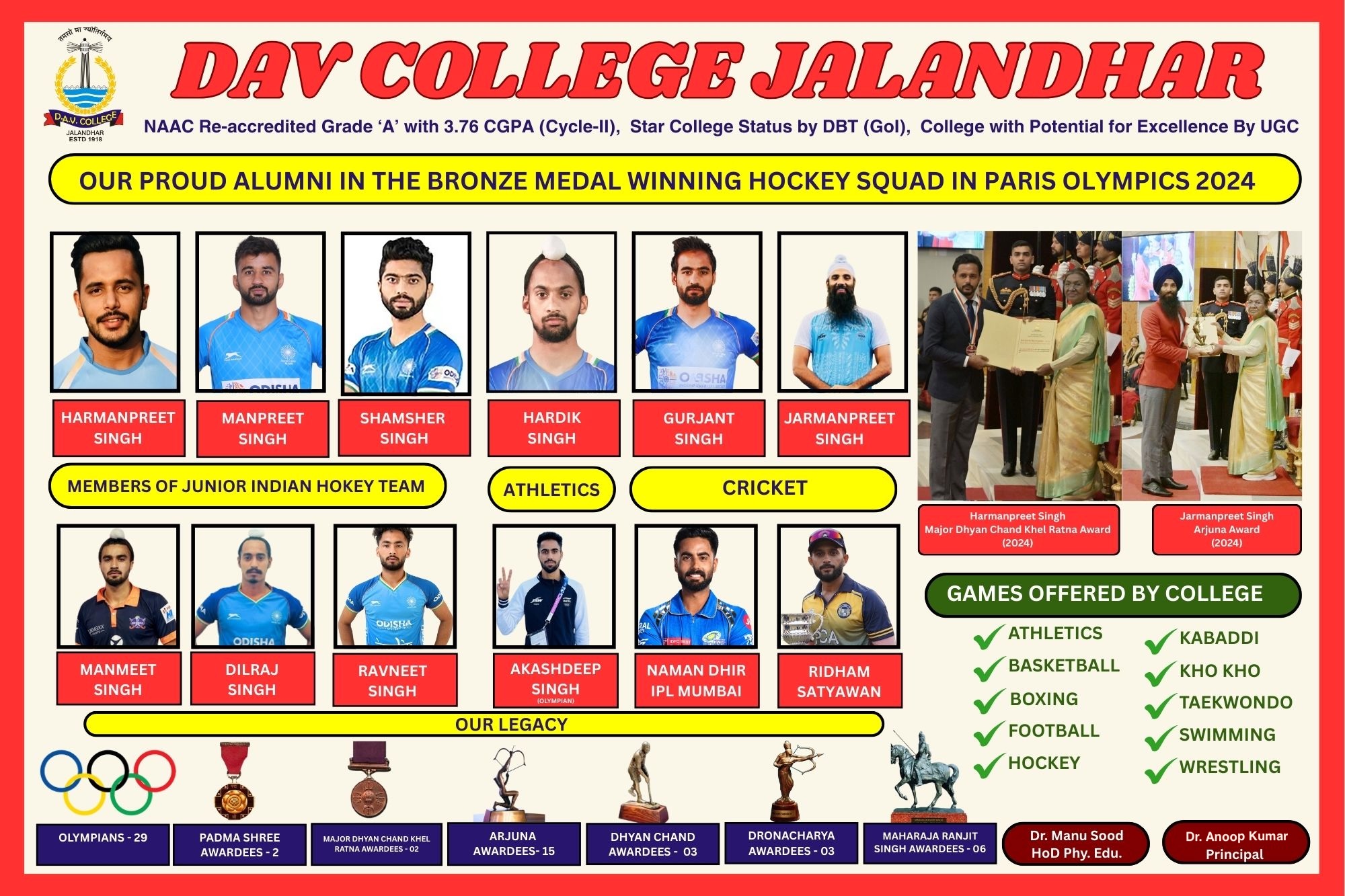The list of alumni makes the college proud. The Nobel laureate – Dr. Hargobind Khurana, renowned Ghazal Maestro – Jagjit Singh, “Hero of American Heart” – Dr. Harvinder Sahota , the world renowned cardiologist & Former Director of PGI Chandigarh and presently advisor to Govt. of Punjab for Health and Medical Education – Dr. K.K. Talwar, noted Bollywood singer – Sukhwinder, famous Sufi singer – Hans Raj Hans, former Indian Ambassador to Pakistan – Sh. Sharat Sabharwal, former Vice-Chancellor of Guru Nanak Dev University Amritsar – Professor A. S. Brar, former Vice-Chancellor Punjab University – Professor Arun Kumar Grover, 18 Olympians, 8 Arjuna Awardee, 2 Dronacharya Awardee and thousands of other distinguished Indians are the proud products of this institution.